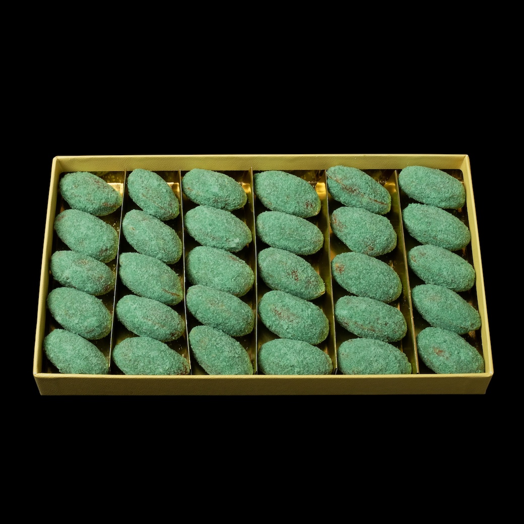 Sucre, AMANDE* (20 %°), NOISETTE* (7 %), sirop de glucose, beurre de cacao, fèves de cacao, LACTOSE, maltodextrine, émulsifiant : lécithine de SOJA* sans OGM, vanille, colorant : E141, extrait de vanille.